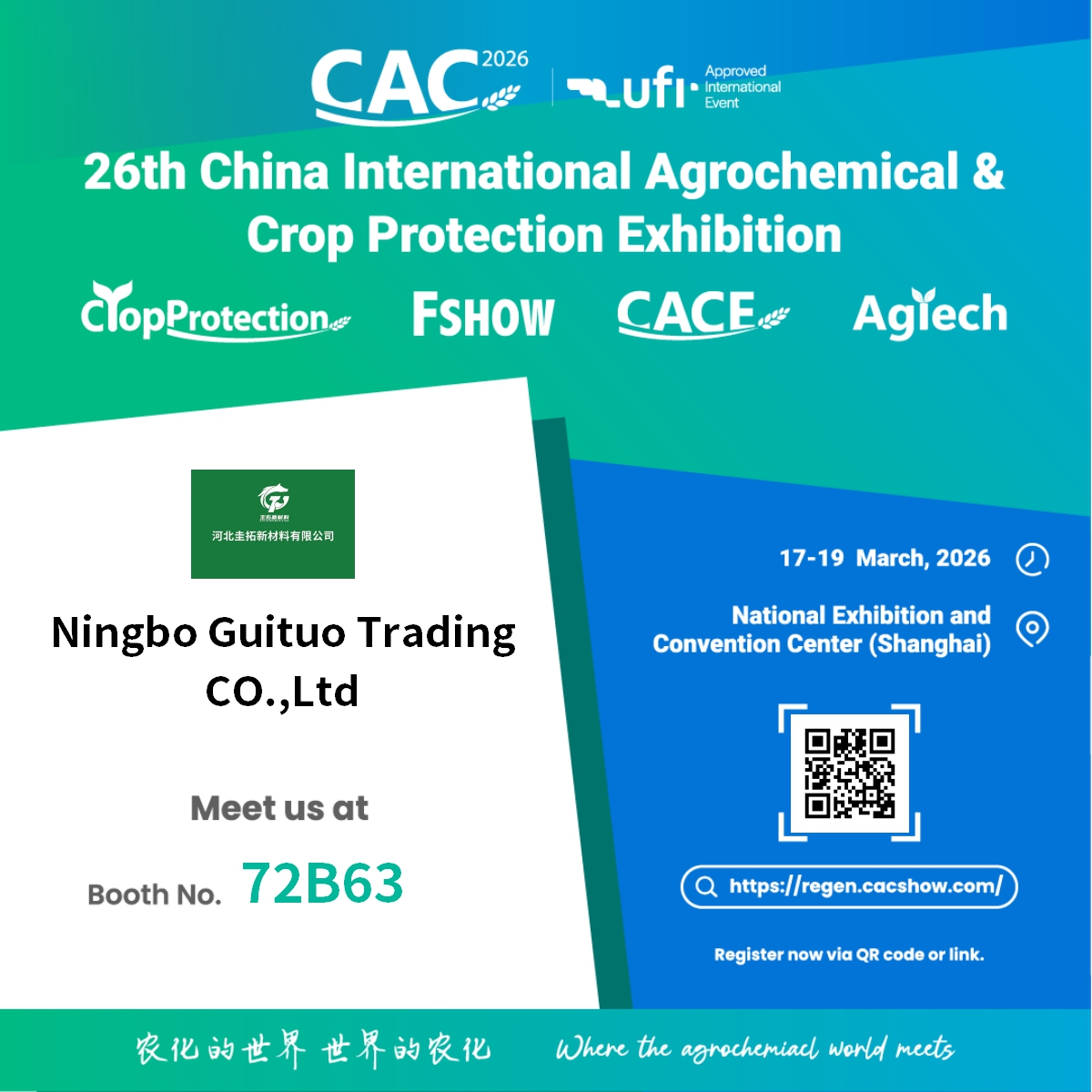 Ningbo Guituo Trading Co., Ltd. dengan bangganya mengumumkan penyertaannya dalam Pameran Agrokimia & Perlindungan Tanaman Antarabangsa China ke-26 (CAC 2026) . Acara global berprestij ini akan berlangsung dari 17 hingga 19 Mac 2026 , di Pusat Pameran dan Konvensyen Kebangsaan di Shanghai.